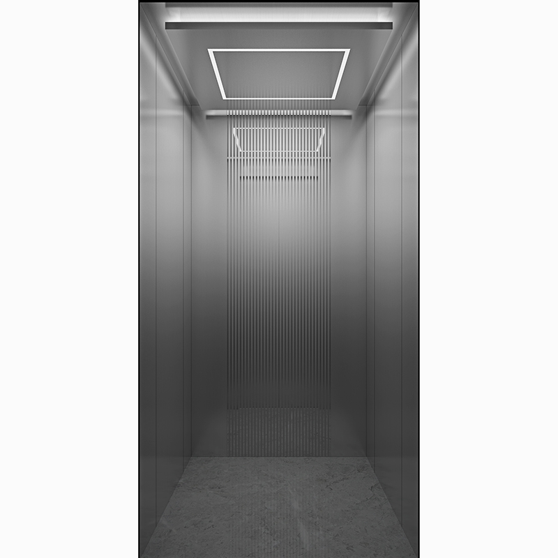 La cabina HF-J008 combina eficiencia y diseño con materiales duraderos como acero satinado y espejo con patrón decorativo. Está equipada con iluminación LED en el techo, brindando un ambiente cómodo y moderno para ascensores residenciales o de bajo tráfico.